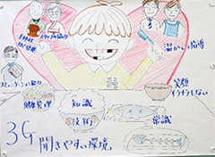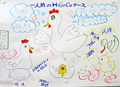 | 新人看護師を、家庭で子どもを育てる ことに置き換えて、必要な栄養やしつ け・支援を考えました。 |