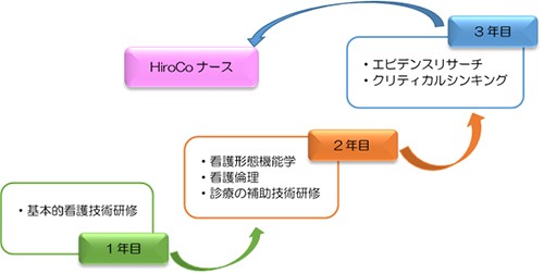本プログラムは、看護基礎教育での「フィジカルアセスメント」および卒後1年目の「基本的看護技術研修」を基盤にし、段階的に一人前の看護師(HiroCoナース)を育成するプログラムです。